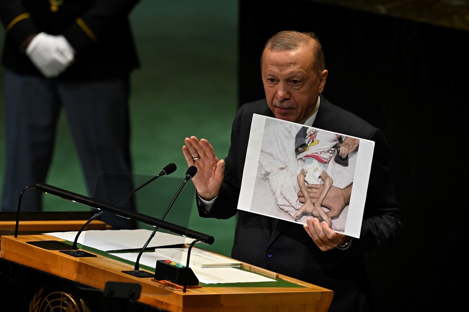 Erdoğan, Birleşmiş Milletler (BM) 80. Genel Kurulu’na yaptığı konuşmada Gazze’de çekilen fotoğrafları gösterdi.