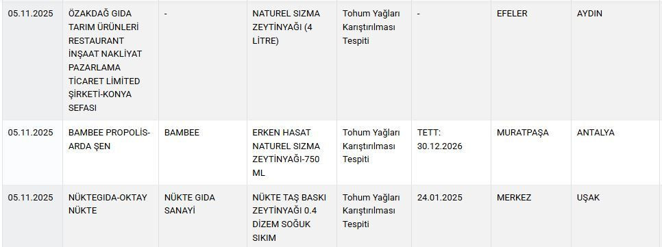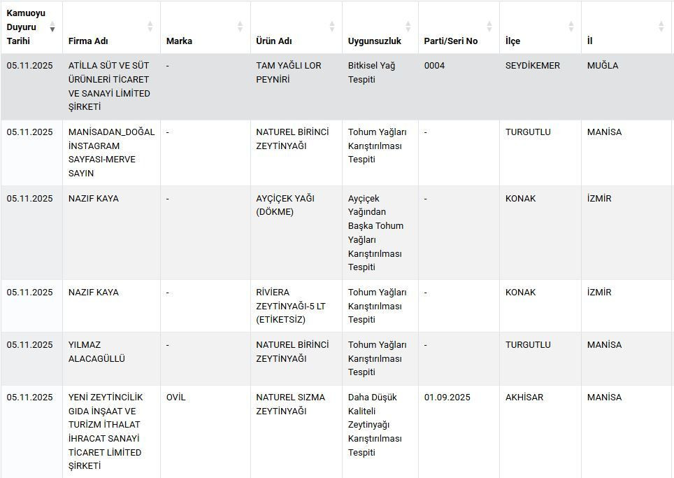Son yapılan testlerde; bitkisel yağda gıdada kullanımına izin verilmeyen boya kullanımı, peynirde nişasta tespiti ve yağ ürünlerinde çeşitli usulsüzlükler yapıldığı tespit edildi.